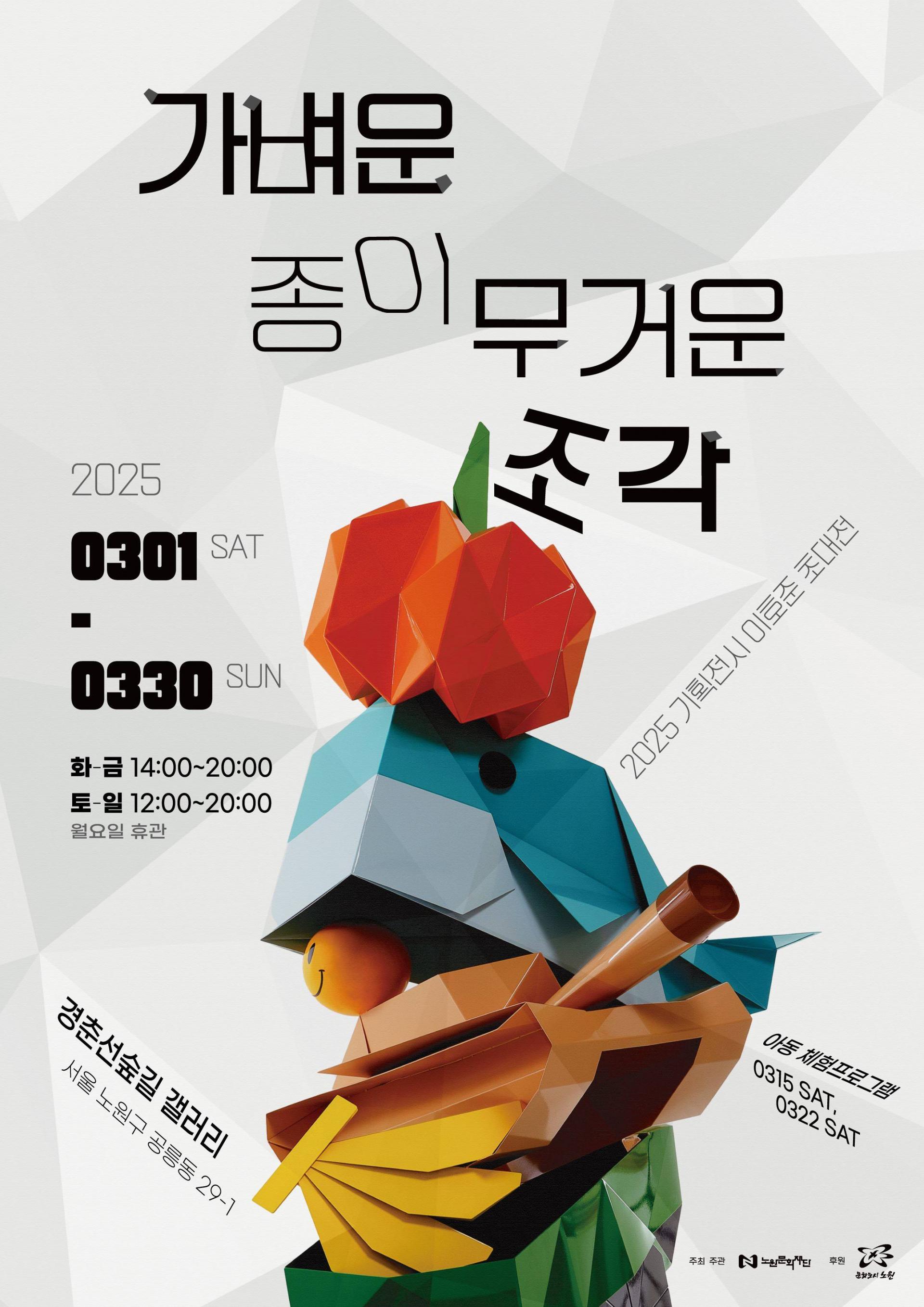 경춘선숲길 화랑대 철도공원에 있는 ‘경춘선숲길 갤러리’에서는 이호준 작가의 초대전 ‘가벼운 종이, 무거운 조각’이 오는 30일까지 진행 중이다. 이번 전시에서는 종이접기의 입체성과 공간감을 활용한 다양한 조각 작품이 전시된다.