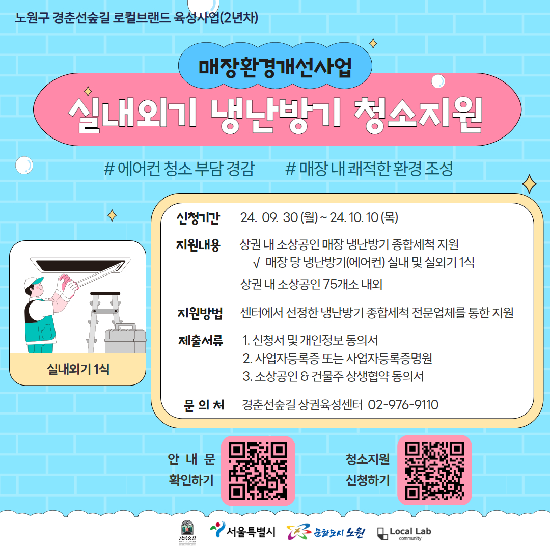 노원구 경춘선공릉숲길 로컬브랜드상권 소상공인의 에어컨 청소 부담을 줄이고, 개별 매장의 환경개선을 통한 청결하고 쾌적한 상권 이미지 구축을