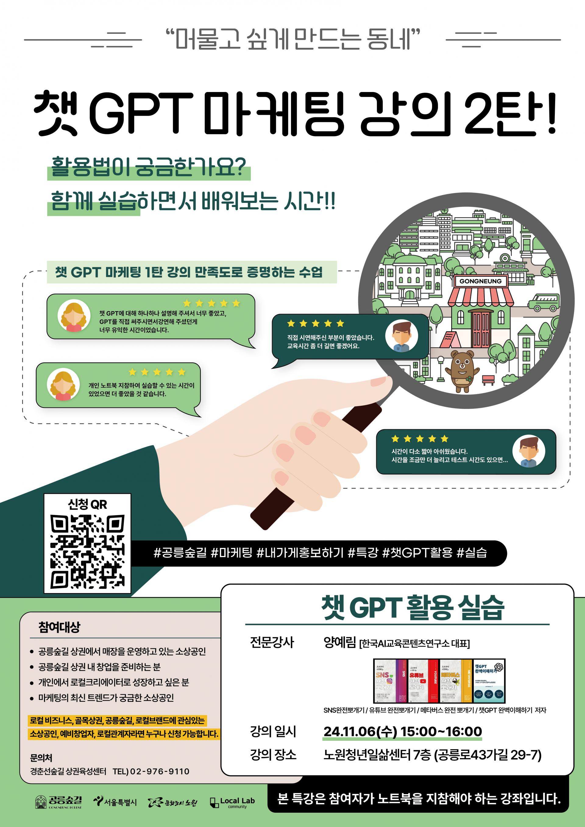 ◆ 주제 : 챗 GPT 활용 실습 ◆ 일정 : 11월 6일(수) 오후 3~4시 ◆ 장소 : 노원청년일삶센터 7층 - 공릉로43가길 29-7, 7층 ◆ 강사 : 양예림(한국AI교육콘텐츠연구소 대표/ 관련 저서 4건)