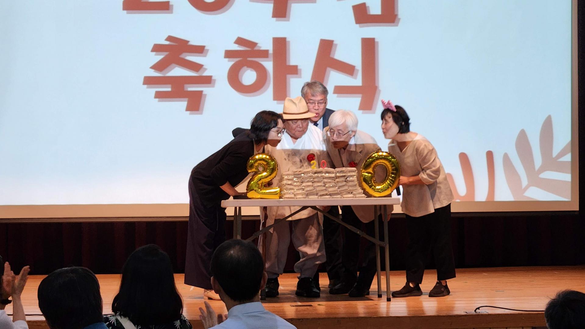 <사진 설명> 지난달 25일 노원구청 대강당에서 열린 함께걸음 20주년 기념식에서 역대 이사장들이 모두 나와 함께 촛불을 끄고 있다.