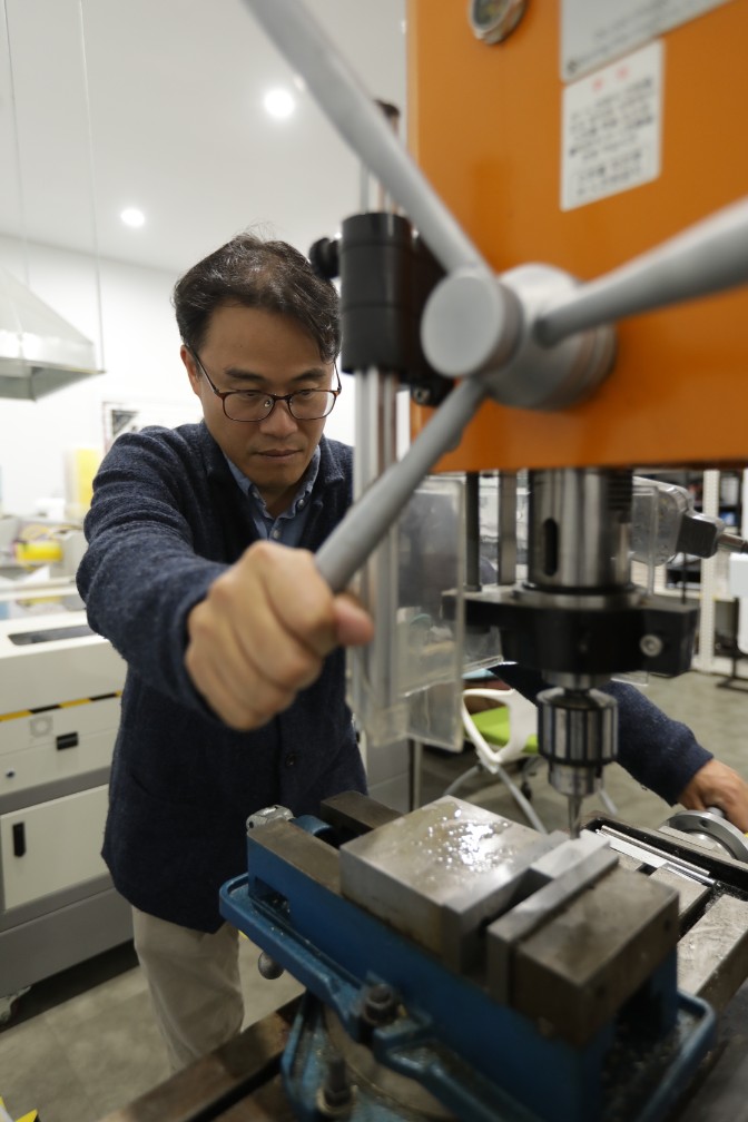 유만선 관장이 아이디어 제작실에서 드릴을 이용해 전시 개선 작업을 하고 있다. <사진=조영준>