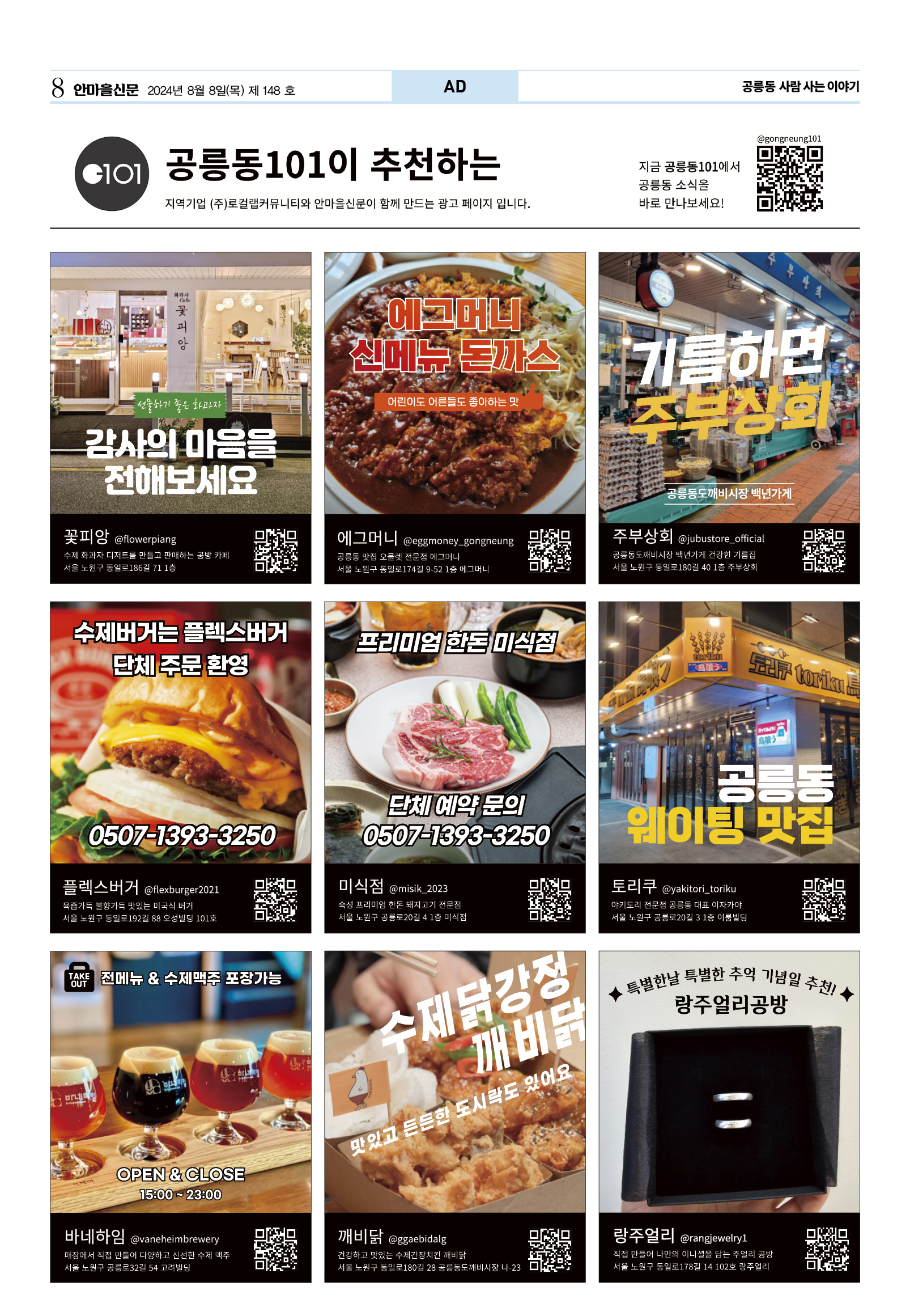 7년동안 많은 어려움이 있었지만, 이웃들의 든든한 지지로 발행을 이어오고 있습니다. 공릉동101과 안마을신문이 함께 지역에 많은 광고를 전할 수 있도록 노력하겠습니다.